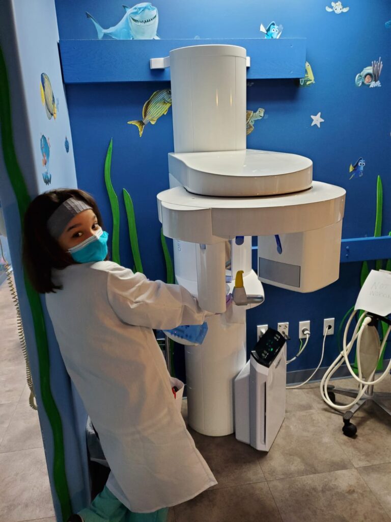 Digital panoramic x-ray shows both the baby teeth in the patient’s mouth as well as the new permanent teeth that are still developing in the jaw bone under the gumline. Low dose digital x-ray lets the dentist evaluate the the child to be sure that the permanent teeth are growing properly.